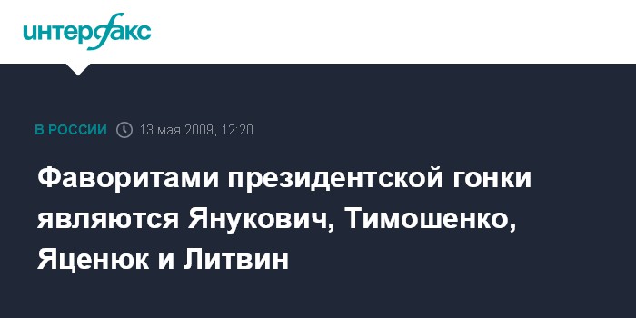 Москва. 13 мая. INTERFAX.RU – Лидерами среди кандидатов в президенты Украины являются лидер Партии регионов Виктор Янукович, премьер-министр Украины Юлия Тимошенко, лидер инициативы "Фронт перемен" Арсений Яценюк и председатель Верховной Рады Владимир Литвин.