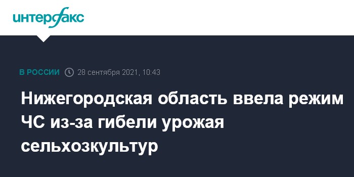Москва. 28 сентября. INTERFAX.RU - Нижегородская область ввела режим чрезвычайной ситуации (ЧС) регионального характера из-за гибели урожая сельскохозяйственных культур вследствие опасных природных явлений – суховеев, почвенной и атмосферной засухи в вегетационный период. Об этом говорится в указе губернатора области.