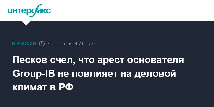 Москва. 29 сентября. INTERFAX.RU - Задержание и арест Ильи Сачкова - основателя российской компании Group-IB, занимающейся вопросами кибербезопасности, не скажется на деловом климате РФ, заявил пресс-секретарь российского президента Дмитрий Песков.