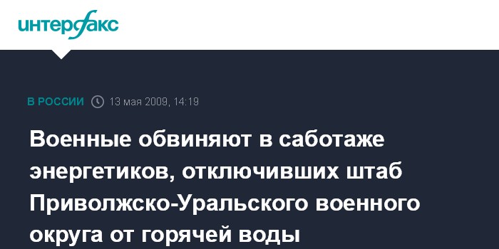 Екатеринбург. 13 мая. INTERFAX.RU - В штабе Приволжско-Уральского военного округа (ПУрВО) энергетики отключили подачу горячей воды, несмотря на то, что военные заявляют о готовности оплатить все коммунальные платежи.