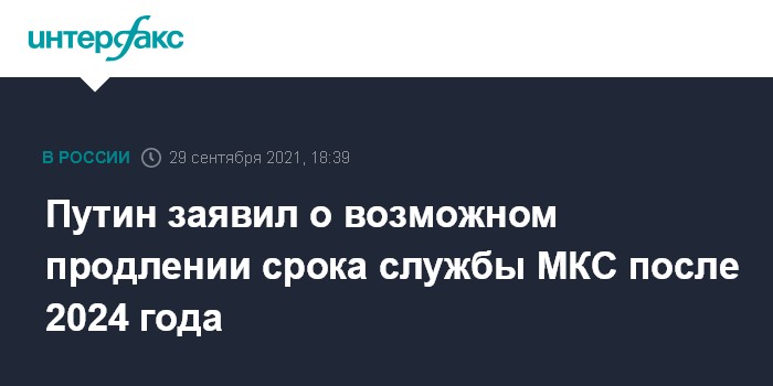 Москва. 29 сентября. INTERFAX.RU - Президент России Владимир Путин заявил о возможном продлении срока службы Международной космической станции (МКС) после 2024 года.