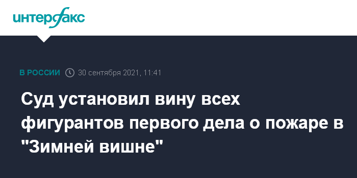 Москва. 30 сентября. INTERFAX.RU - Заводский районный суд Кемерово в четверг установил вину подсудимых по первому уголовному делу о пожаре в ТРЦ "Зимняя вишня" в марте 2018 года.