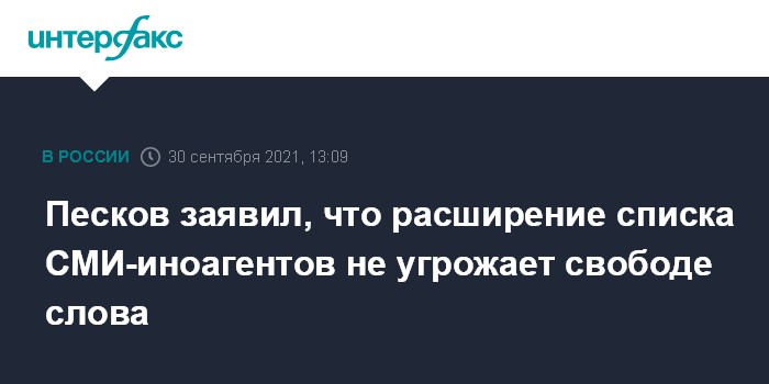 Москва. 30 сентября. INTERFAX.RU - Расширение в России списка СМИ-иноагентов не угрожает свободе слова, заявили в Кремле.
