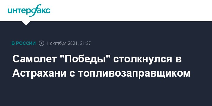 Москва. 1 октября. INTERFAX.RU - В аэропорту Астрахани Boeing-737 "Победы" перед взлетом на рулежной дорожке столкнулся с топливозаправщиком, задев его крылом, сообщил "Интерфаксу" информированный источник.