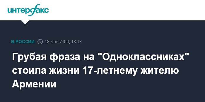 Ереван. 13 мая. ИНТЕРФАКС - Юный житель армянского города Гюмри был избит до смерти после того, как написал грубую фразу в адрес девушки на сайте "Одноклассники.ру".