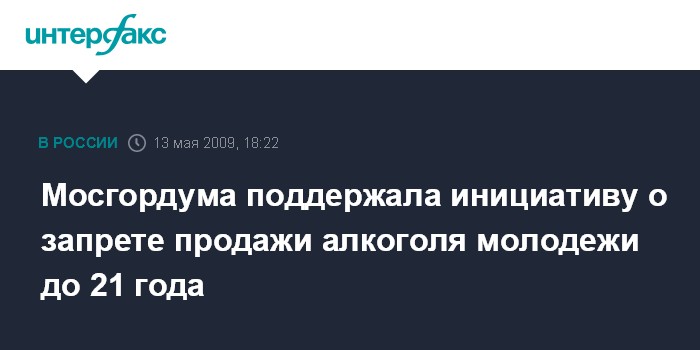 Москва. 13 мая. INTERFAX.RU - На совместном заседании комиссии Московской городской думы по экономической политике и предпринимательству и по здравоохранению и охране общественного здоровья было принято решение о поддержке законодательной инициативы депутата Государственной Думы Антона Белякова, направленной на увеличение возраста, с которого допускается продажа пива, алкогольной и спиртосодержащей продукции с 18 до 21 года.