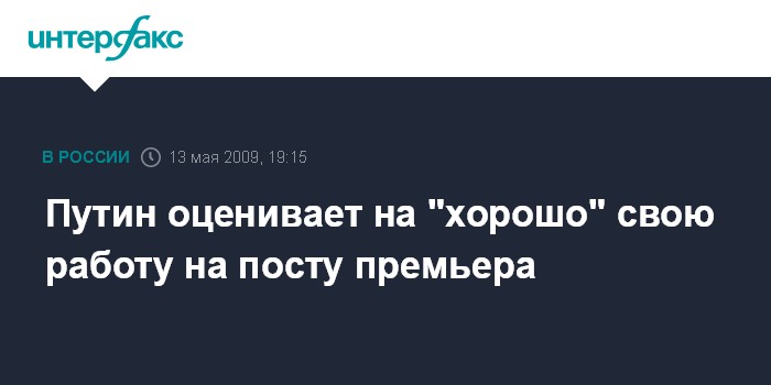 Улан-Батор. 13 мая. INTERFAX.RU - Премьер-министр РФ Владимир Путин ставит себе оценку "хорошо" за деятельность на посту главы правительства РФ.