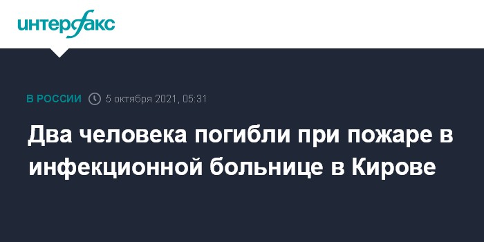 Москва. 5 октября. INTERFAX.RU - В результате пожара в инфекционной больнице в Кирове погибли два человека, сообщает ГУ МЧС по Кировской области.