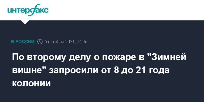 Москва. 5 октября. INTERFAX.RU - Генпрокуратура РФ в ходе судебных прений по делу о пожаре в ТРЦ "Зимняя вишня" в Кемерове, при котором погибли 60 человек, потребовала приговорить экс-начальника инспекции Госстройнадзора Кузбасса Танзилю Комкову к 21 году колонии и штрафу в 450 млн рублей, сообщил "Интерфаксу" во вторник информированный источник.
