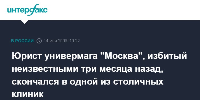 Юрист универмага "Москва", избитый неизвестными три месяца назад, скончался в одной из столичных клиник