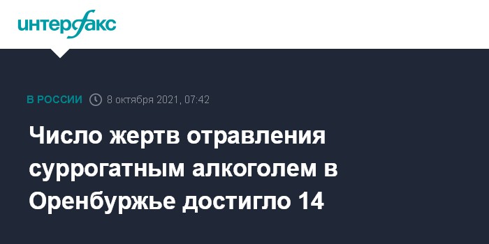 Москва. 8 октября. INTERFAX.RU - До 14 увеличилось количество умерших в результате употребления контрафактного алкоголя в Оренбургской области, сообщает пресс-служба главы региона в своем телеграм-канале в пятницу утром.
