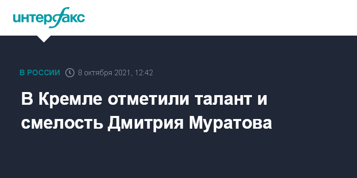 Москва. 8 октября. INTERFAX.RU - В Кремле поздравляют главного редактора "Новой газеты" Дмитрия Муратова, который стал лауреатом Нобелевской премии мира.