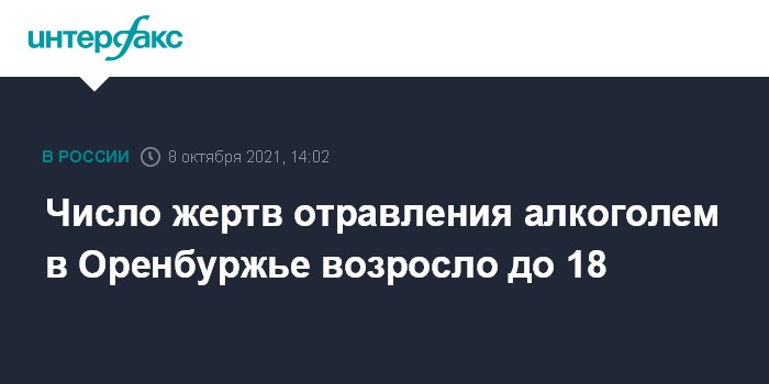 Москва. 8 октября. INTERFAX.RU - Количество погибших в результате отравления контрафактным алкоголем в Оренбургской области увеличилось до 18, сообщает пресс-служба правительства региона в своем телеграм-канале в пятницу.