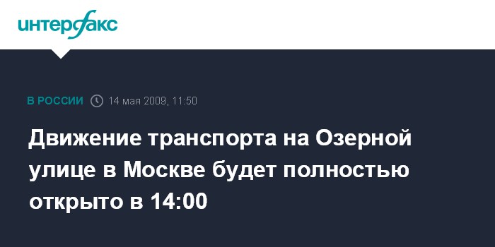 Москва. 14 мая. INTERFAX.RU – Движение транспорта на Озерной улице, где проводился ремонт газопровода, будет полностью восстановлено к 14 часам четверга, сообщили "Интерфаксу" в городской администрации.