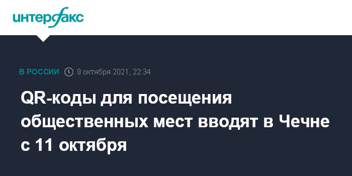 Москва. 9 октября. INTERFAX.RU - Жители Чечни с 11 октября смогут посещать общественные места только при наличии свидетельств прохождения вакцинации COVID-19 или сведений о перенесенном заболевании коронавирусом в течение полугода, сообщает в субботу Чеченская государственная телерадиокомпания "Грозный".