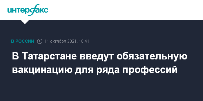 Москва. 11 октября. INTERFAX.RU - В Татарстане введут обязательную вакцинацию от коронавируса для граждан возрастом 60 лет и старше, также для некоторых профессий, объявило региональное управление Роспотребнадзора.