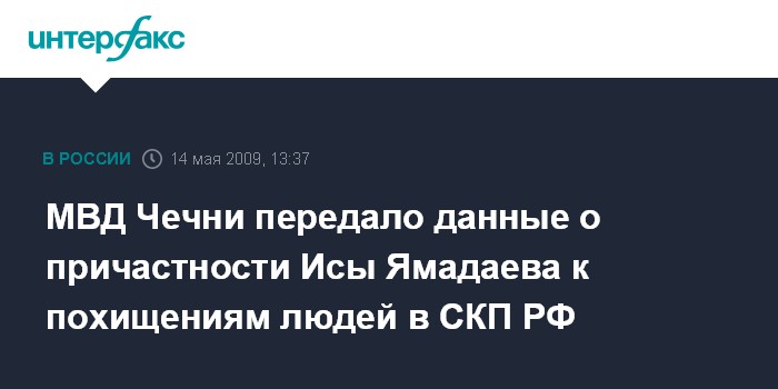 Москва. 14 мая. INTERFAX.RU - Министерство внутренних дел Чеченской республики располагает данными о причастности Исы Ямадаева - брата бывшего командира батальона "Восток" Сулима Ямадаева - к похищениям людей и готово оказать помощь СКП РФ по Чечне в доследственных действиях.