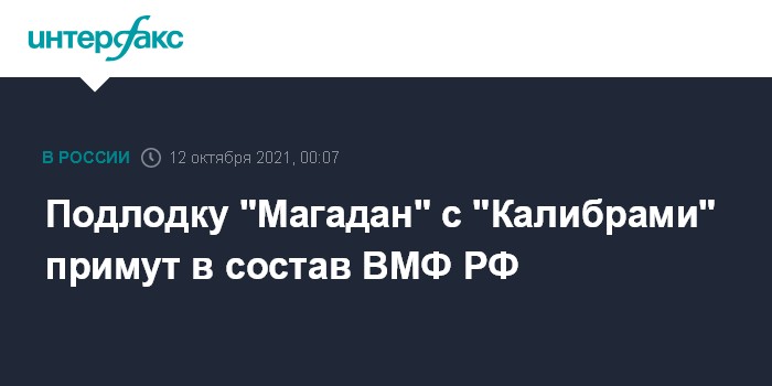 Москва. 12 октября. INTERFAX.RU - Дизельную подводную лодку "Магадан", построенную для Тихоокеанского флота, во вторник, 12 октября, планируют включить в боевой состав Военно-морского флота России.