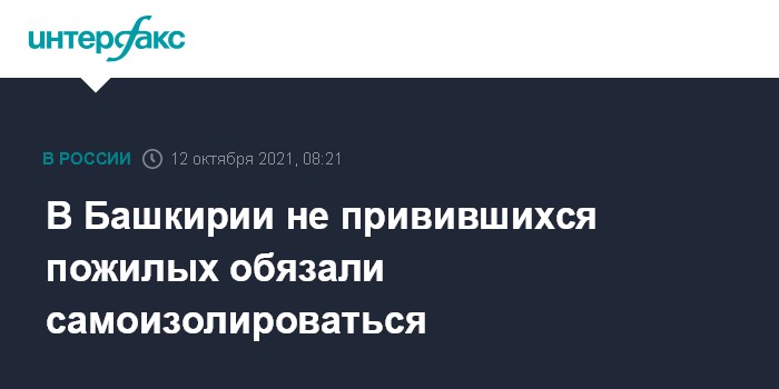 Москва. 12 октября. INTERFAX.RU - Глава Башкирии Радий Хабиров сообщил, что по просьбам главврачей вводит в республике с 13 октября режим обязательной самоизоляции для людей возрастом 65 лет и старше, которые не привились от коронавируса.