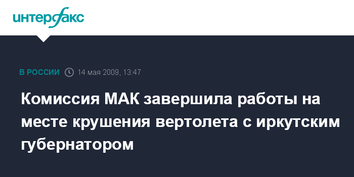 Москва. 14 мая. INTERFAX.RU - Комиссия Межгосударственного авиационного комитета (МАК) завершила работы на месте крушения вертолета Bell 407 в Иркутской области, в результате которого погиб губернатор области Игорь Есиповский.
