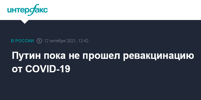 Москва. 12 октября. INTERFAX.RU - Президент РФ Владимир Путин пока не проходил процедуру ревакцинации от коронавируса, поскольку у него сохраняются высокие титры антител, сообщил его пресс-секретарь РФ Дмитрий Песков.