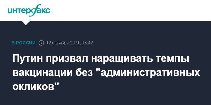 Москва. 12 октября. INTERFAX.RU - Темпы вакцинации от коронавируса нужно наращивать без административного давления, терпеливо объяснять людям ее необходимость, заявил президент РФ Владимир Путин.