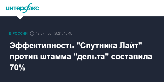 Москва. 13 октября. INTERFAX.RU - Исследование центра имени Гамалеи показало эффективность российской вакцины "Спутник Лайт" против "дельта" штамма коронавируса на уровне 70% в течение трех месяцев после прививки. Препринт соответствующей статьи опубликован на портале medRxiv, сообщила в среду пресс-служба Российского фонда прямых инвестиций (РФПИ).