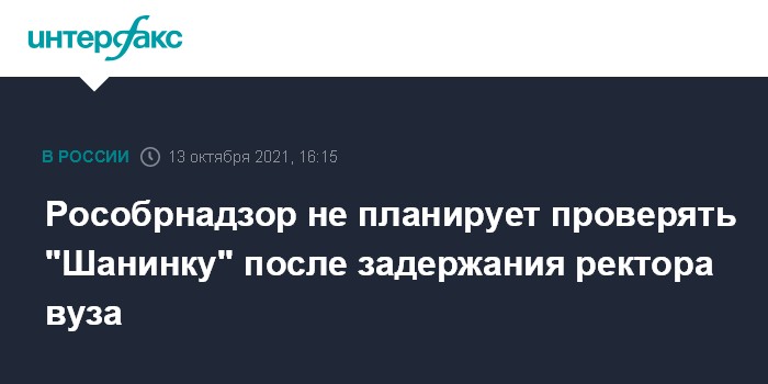 Москва. 13 октября. INTERFAX.RU - Рособрнадзор не планирует проверять деятельность Московской высшей школы социальных и экономических наук ("Шанинка") после того, как ректор вуза Сергей Зуев был задержан в рамках дела о мошенничестве экс-замминистра просвещения РФ и бывшего вице-президента Сбербанка Марины Раковой, сообщили "Интерфаксу" в ведомстве.