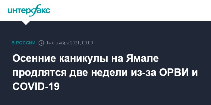 Москва. 14 октября. INTERFAX.RU - Осенние каникулы для школьников в Ямало-Ненецком автономном округе увеличили до двух недель из-за эпидемиологической ситуации, сообщает в четверг региональный оперштаб.