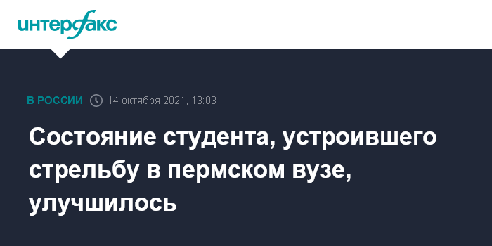 Москва. 14 октября. INTERFAX.RU - Самочувствие Тимура Бекмансурова, который в сентябре устроил стрельбу в Пермском госуниверситете (ПГНИУ), улучшилось до удовлетворительного, сообщили "Интерфаксу" в пресс-службе регионального Минздрава в четверг.