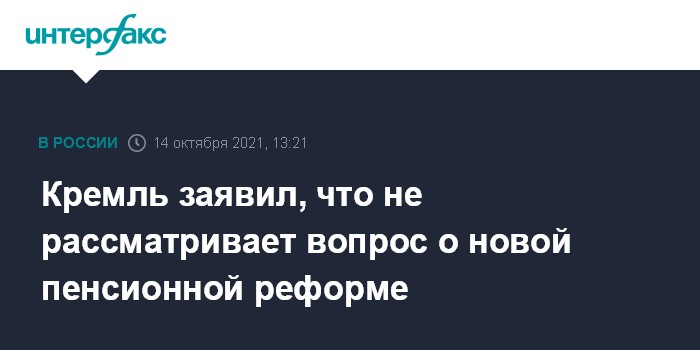 Москва. 14 октября. INTERFAX.RU - В Кремле заявили, что вопрос о новой пенсионной реформе в России не обсуждается.