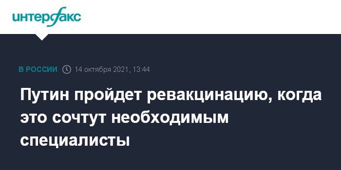 Москва. 14 октября. INTERFAX.RU - Ревакцинация президента РФ Владимира Путина от коронавируса зависит от рекомендации специалистов, как только они посчитают это необходимым, эта процедура будет им пройдена, заявил пресс-секретарь главы государства Дмитрий Песков.