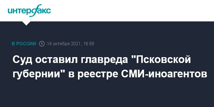 Москва. 14 октября. INTERFAX.RU - Псковский областной суд оставил в силе решение Псковского городского суда об отказе удовлетворить иска главного редактора издания "Псковская губерния" Дениса Камалягина о признании незаконным его включение в реестр иностранных СМИ-иноагентов, сообщила пресс-служба судов общей юрисдикции Псковской области.