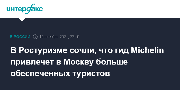 Москва. 14 октября. INTERFAX.RU - Появление в Москве ресторанов со звездами Michelin привлечет в российскую столицу и в страну в целом больше обеспеченных туристов и повысит экспорт туристических услуг, сообщила в четверг глава Ростуризма Зарина Догузова.
