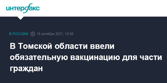 "В Томской области вакцинированы всего 46% от необходимого количества людей. Поэтому с 15 октября вслед за большинством регионов страны мы вынуждены ввести обязательную вакцинацию. Пока она касается отдельных категорий работников", - сказал Жвачкин.
