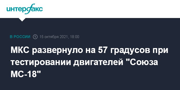 Москва. 15 октября. INTERFAX.RU - Разворот МКС при тестировании корабля "Союз МС-18" составил 57 градусов, сообщил руководитель полета российского сегмента Владимир Соловьев.