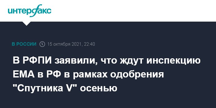 Москва. 15 октября. INTERFAX.RU - Глава Российского фонда прямых инвестиций (РФПИ) Кирилл Дмитриев ожидает визита инспекции Европейского агентства лекарственных средств (ЕМА) в Россию в рамках процедуры одобрения вакцины "Спутник V" осенью.
