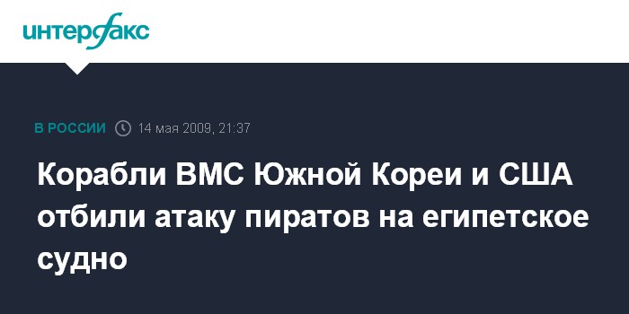 Вашингтон. 14 мая. INTERFAX.RU - Южнокорейский эсминец "Мунму Великий" и крейсер ВМС США "Геттисбург" в Аденском заливе в четверг отбили нападение на египетское торговое судно "Амира", взяв в плен 17 человек, сообщает американская телекомпания CNN со ссылкой на заявление ВМС США.