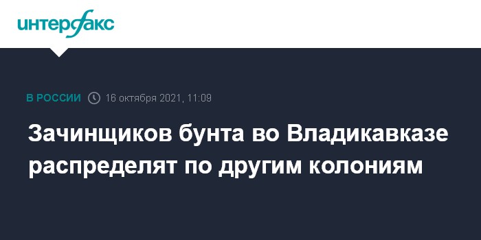 Москва. 16 октября. INTERFAX.RU - Принято решение распределить устроивших беспорядки в ИК №1 Владикавказа (Северная Осетия) заключенных по другим колониям, сообщил "Интерфаксу" в субботу информированный источник.