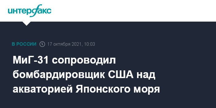 Москва. 17 октября. INTERFAX.RU - Российский истребитель-перехватчик дальнего радиуса действия МиГ-31 поднимался в воздух для сопровождения над Японским морем стратегического бомбардировщика B-1B ВВС США, сообщили в воскресенье в Национальном центре управления обороной РФ.
