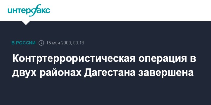 Москва. 15 мая. INTERFAX.RU - Режим контртеррористической операции, введенный в среду по периметру нескольких населенных пунктов Хасавюртовского и Казбековского районов, отменен в четверг, сообщили "Интерфаксу" в Группе общественных связей (ГОС) УФСБ России по Дагестану.