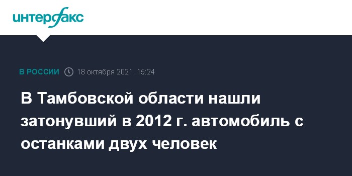 Москва. 18 октября. INTERFAX.RU - Останки двух человек обнаружили в легковом автомобиле, который, предположительно, еще в 2012 году затонул в Жердевском районе Тамбовской области. Об этом сообщила в понедельник пресс-служба следственного управления СКР по региону.