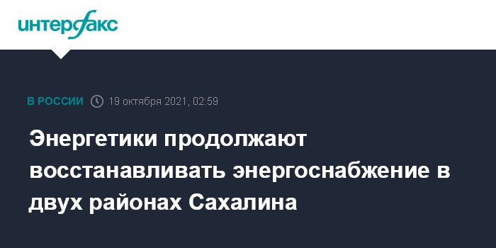 Москва. 19 октября. INTERFAX.RU - Энергетики продолжают ликвидировать последствия циклона, энергоснабжение восстанавливают в трех селах Тымовского района и в городе Александровске-Сахалинском, сообщает пресс-служба энергокомпании во вторник.