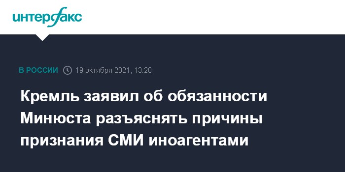 Москва. 19 октября. INTERFAX.RU - Кремль не является и не может быть арбитром между журналистами и Минюстом в части оценки правомерности признания СМИ иноагентами без конкретных мотивировок и объяснений, заявил пресс-секретарь президента РФ Дмитрий Песков.