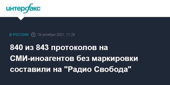 "Всего в 2021 году за отсутствие маркировки Роскомнадзором составлено 843 протокола. Из них 840 составлено в отношении ООО "Радио Свободная Европа/Радио Свобода" (российского юрлица, созданного для распространения материалов девяти СМИ-иноагентов на территории РФ) и его гендиректора: 390 протоколов - по ч. 1, 420 - по ч. 2 и 30 по ч. 3 ст. 19.34.1 КоАП РФ", - сказали в ведомстве.
