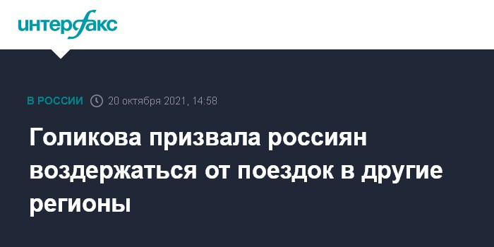 "Сейчас и в период нерабочих дней большая просьба к нашим гражданам воздержаться от поездок в другие регионы, чтобы не осложнять эпидситуацию и не увеличивать нагрузку на медицинскую систему конкретных регионов", - сказала Голикова в среду на совещании президента РФ Владимира Путина с членами правительства.