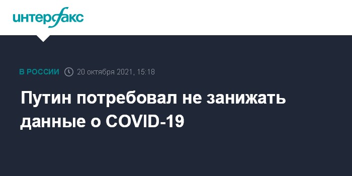 Москва. 20 октября. INTERFAX.RU - Регионы не должны занижать данные по коронавирусу, заявил президент Владимир Путин и назвал подобные действия "опасными и безответственными". Он сказал об этом на совещании с членами правительства, которое проходит в режиме видеоконференции.