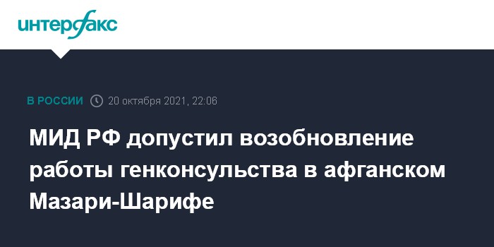 Москва. 20 октября. INTERFAX.RU - Россия прорабатывает возможность возобновления работы генерального консульства в Мазари-Шарифе в Афганистане. Об этом сообщил спецпредставитель президента по Афганистану, директор второго департамента Азии МИД РФ Замир Кабулов в эфире телеканала "Россия-24".