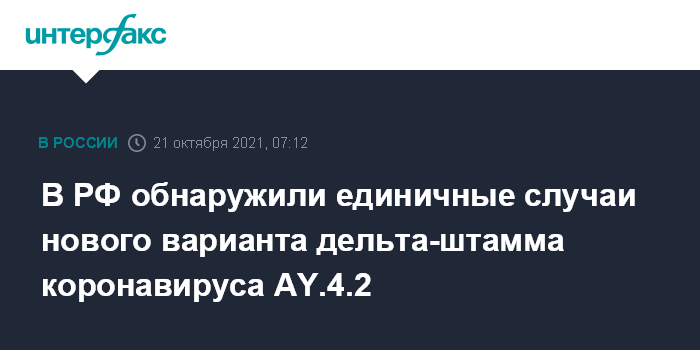 Москва. 21 октября. INTERFAX.RU - В России выявлены единичные случаи новой разновидности дельта-штамма AY.4.2 коронавируса, которая имеет вероятность широкого распространения, заявил руководитель научной группы разработки новых методов диагностики заболеваний человека ЦНИИ эпидемиологии Роспотребнадзора Камиль Хафизов.