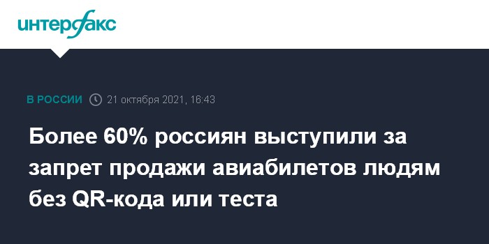 Москва. 21 октября. INTERFAX.RU - Практически две трети россиян (64%) в случае серьёзного ухудшения эпидемиологической ситуации поддержали бы такую меру, как продажа авиабилетов только при наличии QR-кодов, подтверждающих вакцинацию от COVID-19, или отрицательного результата теста ПЦР, показывают результаты опроса ВЦИОМ.